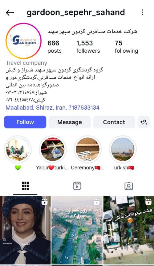 گردون سپهر سهند شیراز یکی از شرکتهای باسابقه و رسمی در حوزه گردشگری و حملونقل هوایی این شهر است. این شرکت با بهرهمندی از مجوزهای بند «الف» هواپیمایی کشوری و بند «ب» گردشگری، خدمات متنوعی در زمینه سفر، تور، بلیت و خدمات سفر ارائه میدهد. مدیریت ارشد این مجموعه شامل مدیرعامل آقای مهدی راستی و رئیس هیئتمدیره خانم شیده نعمتالهی میشود، با تیمی از مدیران و کارشناسان با تجربه که در خلق تجربهای حرفهای برای مسافران نقشآفرینی میکنند.
