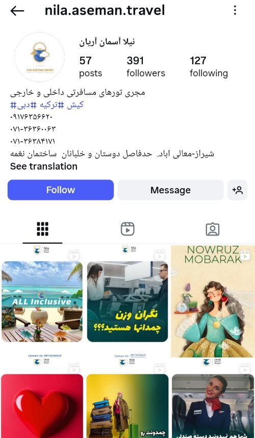 آژانس نیلا آسمان آریان شیراز یکی از مجموعههای رسمی و معتبر در حوزه گردشگری و خدمات مسافرتی در شهر شیراز است. این آژانس با مدیریت خانم موسوی فعالیت میکند و دارای مجوز رسمی از وزارت میراث فرهنگی، گردشگری و صنایع دستی است. با سالها تجربه و سابقه درخشان، این مجموعه توانسته جایگاه قابل توجهی در میان مسافران و گردشگران بهدست آورد.